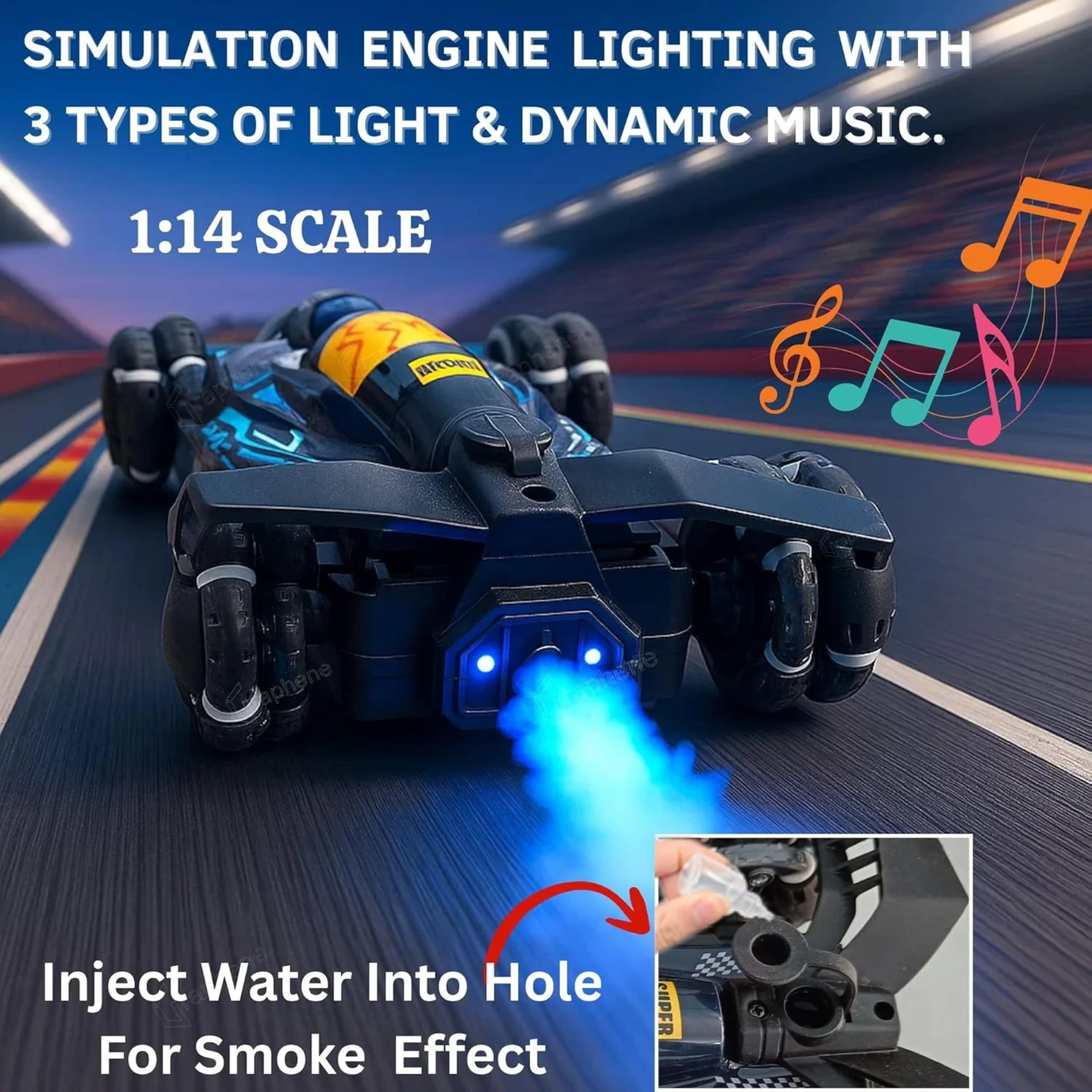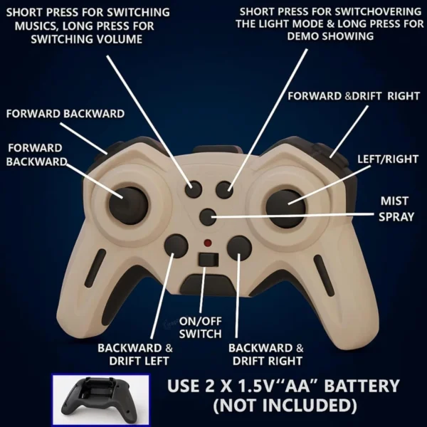 Unleash the adrenaline rush with the Spray Light Electric Remote Control Car—a high-performance RC racer that combines futuristic design with exhilarating features! This powerful machine boasts a simulated nitrogen spray effect that illuminates the track, turning every race into an electrifying spectacle. Powered by a robust four-wheel drive system, this RC car conquers any terrain effortlessly, be it rocky paths or grassy fields. With its sleek and aerodynamic body, it delivers unmatched speed and agility, leaving your competitors in the dust. Experience the ultimate thrill as you control this racing marvel with the included remote, executing hairpin turns and daring manoeuvres. Get ready to dominate the track and leave a trail of smoke in your wake with this cutting-edge RC car! Remote Car for kids. Best Gift For Kids.